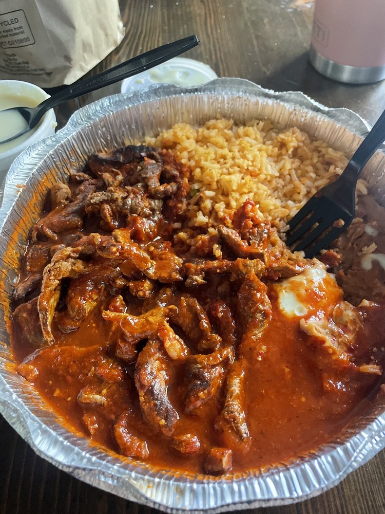 Pork chuncks & nopales cooked in red sauce served with mexican rice & charro beans.